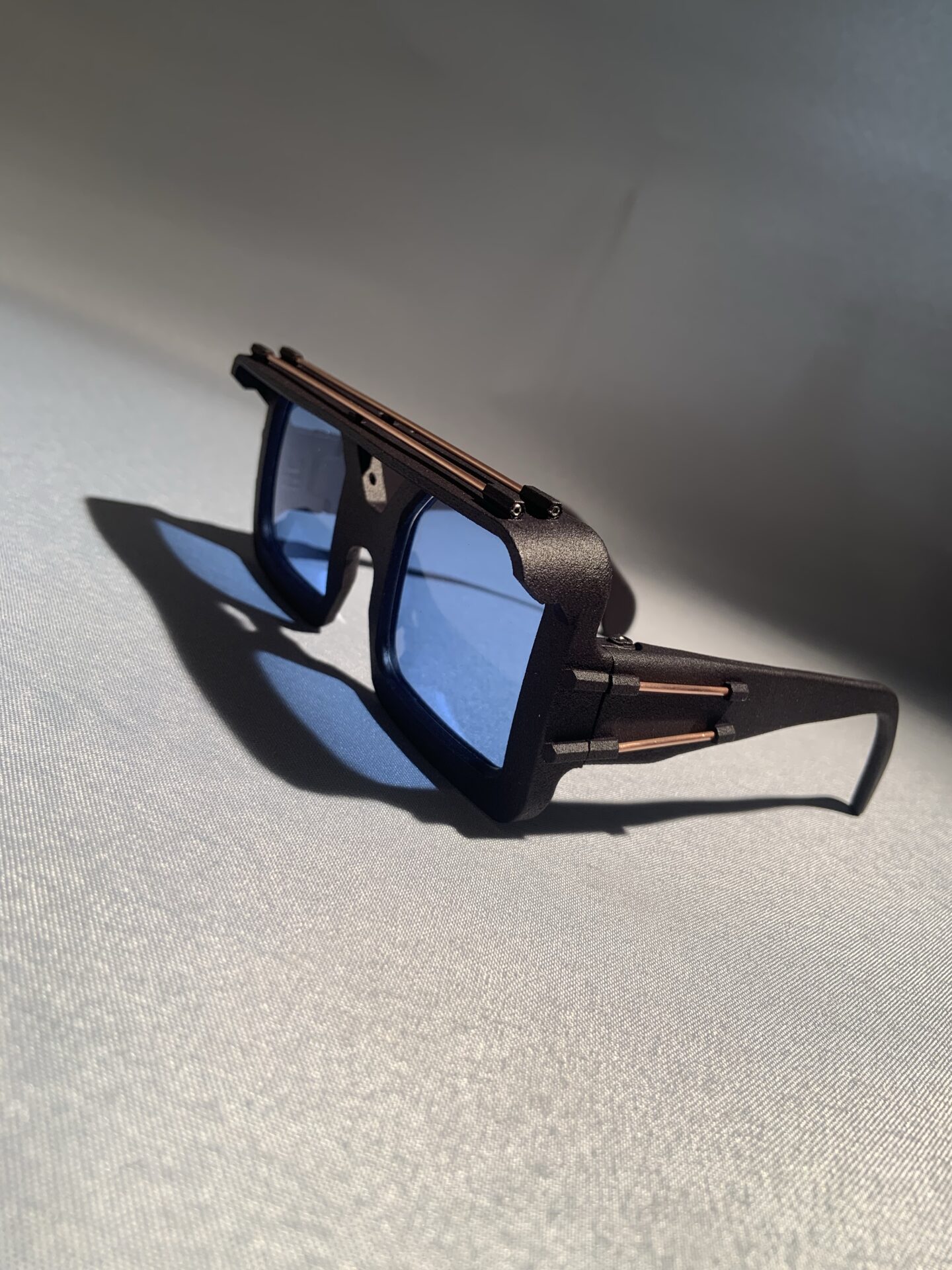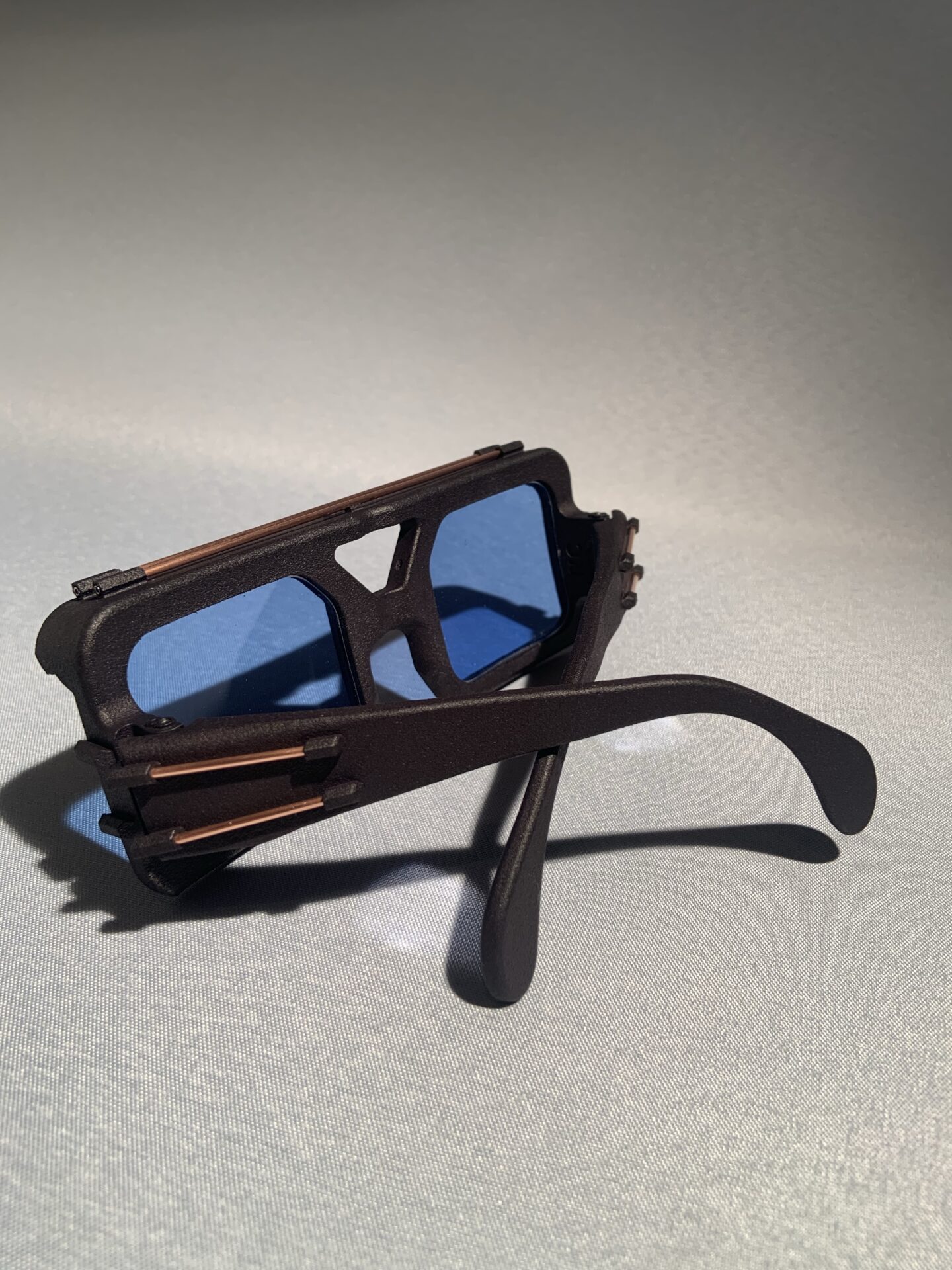 This striking frame is inspired by the copper age. This was a crucial time period in human history in the mid-5th millennium BC. Copper remains one of the earths most beautiful elements and is on full display in this functional architectural art piece. Copper tubing projects across the visor and down the temples. Under it all is a powerful base of black structural robust line work. The Copper Age returns!